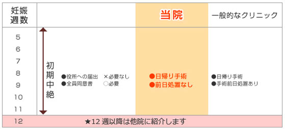 当院で人工妊娠中絶手術を日帰りで行える可能週数は、妊娠5週から12週未満までです。